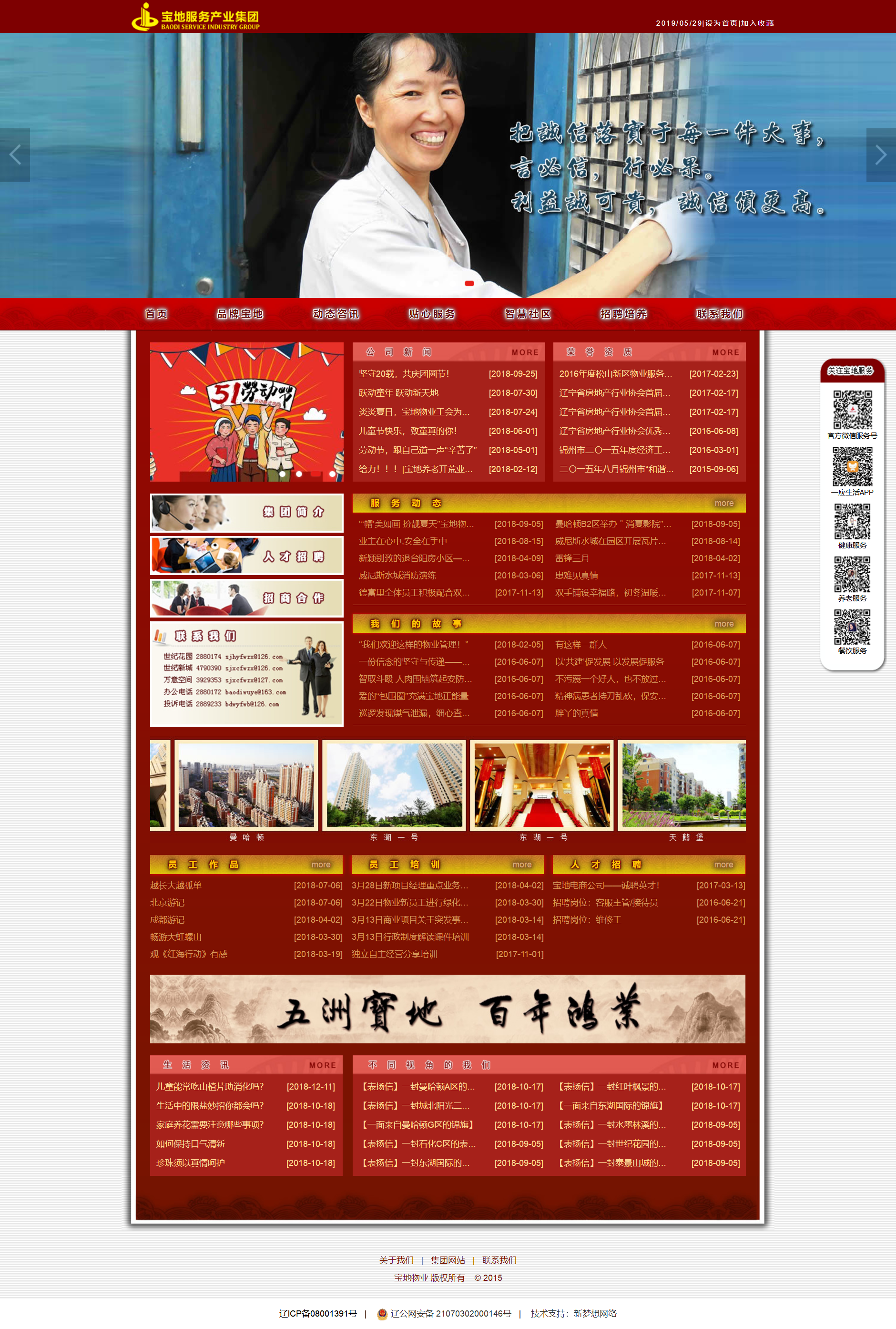 錦州寶地物業(yè)服務(wù)有限責(zé)任公司在錦城規(guī)?;^(qū)發(fā)展建設(shè)中應(yīng)運而生,其成立于1998年,如今的寶地物業(yè)已經(jīng)是錦州唯一一家擁有國家一級物業(yè)服務(wù)資質(zhì)的物管服務(wù)企業(yè)。公司踐行“造福萬家、創(chuàng)新發(fā)展、精進成仁、自省自律、誠信為本”的五行文化理念,以“您的滿意是我們永遠的追求”為服務(wù)宗旨,力求為業(yè)主打造高品質(zhì)的物業(yè)服務(wù)。隨著公司規(guī)模的不斷壯大,目前公司現(xiàn)有員工2500余人,承接項目100余個,其中涵蓋了普通住宅、辦公樓及商業(yè)綜合體項目等,總服務(wù)面積達到了1000余萬平方米,其中世紀花園小區(qū)、巴黎豪苑小區(qū)、東方庭院小區(qū)、寶地城小區(qū)、曼哈頓小區(qū)、東湖一號等多個小區(qū)獲得國家、省、市優(yōu)秀示范小區(qū)等榮譽稱號。